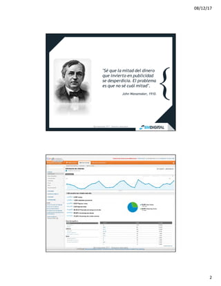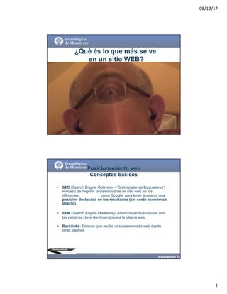 Este documento trata sobre posicionamiento web (SEO). Explica conceptos básicos como SEO, SEM y backlinks. Luego, describe las fases de un proyecto SEO incluyendo selección de palabras clave, buscadores y directorios de interés, y aplicación de técnicas de posicionamiento como on-page y off-page. Finalmente, destaca la importancia de medir los resultados a través de herramientas como Google Analytics.