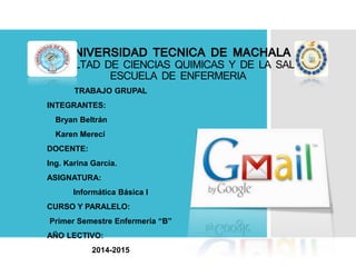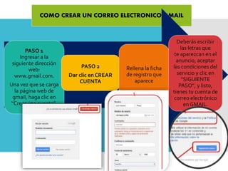 Este documento presenta los pasos para crear una cuenta de correo electrónico Gmail, compartir archivos a través de Gmail y agregar contactos en Gmail. Explica el proceso paso a paso de ingresar a la página web de Gmail, completar la información de registro, aceptar los términos y condiciones, y listo tendrá su cuenta. Para compartir archivos, selecciona los destinatarios, adjunta el archivo deseado y envía. Finalmente, para agregar contactos se ingresa a la opción de contactos, se hace clic en