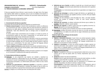 Este documento define y explica los diferentes tipos de discurso expositivo y sus características. Explica que el discurso expositivo busca informar a los lectores sobre un tema. Luego describe las formas básicas del discurso expositivo, incluyendo la definición, descripción, caracterización y narración. Finalmente, explica los cinco modelos más comunes de organización de textos expositivos: problema-solución, causa-consecuencia, encuadrado, paralelo y cronológico.