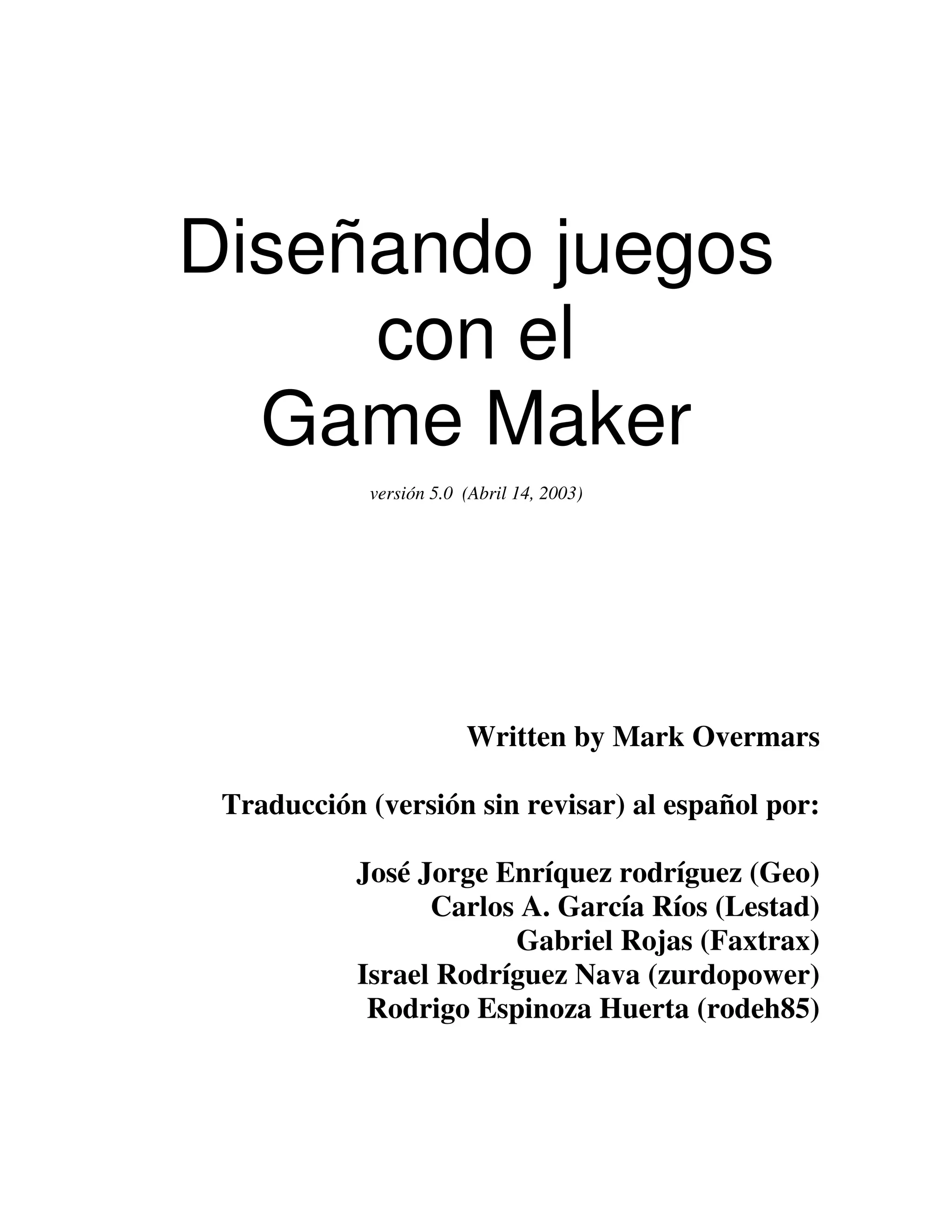 Este documento proporciona una introducción al uso del software Game Maker para diseñar juegos. Explica cómo instalar el software, crear sprites, sonidos, fondos y objetos. También cubre la creación de eventos, acciones y habitaciones para desarrollar la lógica del juego. Por último, presenta los conceptos básicos del lenguaje de programación incorporado de Game Maker.