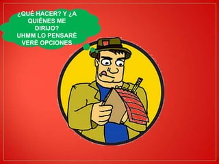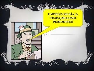 El documento describe las actividades y reflexiones de un periodista durante su día de trabajo. El periodista considera varias opciones de historias para cubrir, incluyendo una sobre un homicidio relacionado con el narcotráfico y un accidente automovilístico. Recopila notas de ambos eventos a través de entrevistas y monitoreo de noticias. Finalmente, el periodista se prepara para transmitir un informe objetivo sobre los hechos a la audiencia.
