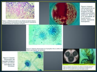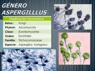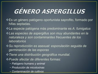 Este documento describe las características de los hongos del género Aspergillus. Son hongos saprofitos comunes que forman hifas septadas y pueden causar infecciones oportunistas en humanos y animales. La especie más frecuente es A. fumigatus. Se reproducen de forma asexual mediante esporulación y sus esporas se encuentran ampliamente distribuidas en la naturaleza.