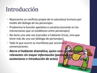 El documento analiza el género dramático, sus orígenes en Grecia y su estructura tanto externa como interna. Destaca la importancia del conflicto dramático y la interacción entre personajes, incluyendo protagonismo y oposición entre fuerzas. Además, se presentan diferentes tipos de obras dramáticas como tragedia, comedia y drama, subrayando sus características fundamentales.