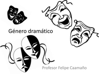 El documento define el género dramático como aquel que representa conflictos humanos a través del diálogo. Tuvo su origen en Grecia asociado al culto de Dionisio. Presenta la estructura interna de la obra dramática con la presentación del conflicto, desarrollo, clímax y desenlace. También define la comedia y la tragedia, señalando que la primera genera risas y la segunda termina de forma triste.