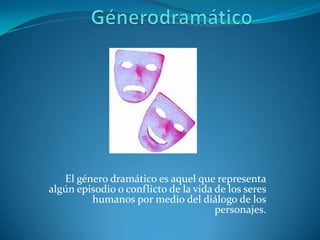 El documento define el género dramático como aquel que representa conflictos de la vida humana a través del diálogo de los personajes. Explica que una tragedia involucra personajes enfrentados de forma misteriosa mientras que una comedia usa las dificultades cotidianas para hacer reír al público y terminar de forma feliz. También menciona Romeo y Julieta como una tragedia famosa y El Chavo del Ocho como una conocida comedia.