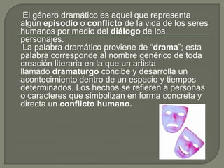 El documento describe el género dramático, incluyendo su origen en Grecia y los dramaturgos griegos más importantes como Sófocles y Eurípides. Explica que una obra dramática típicamente presenta un conflicto que se desarrolla y resuelve al final. También divide el género dramático en formas mayores como la tragedia, comedia y drama, así como formas menores.