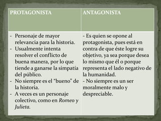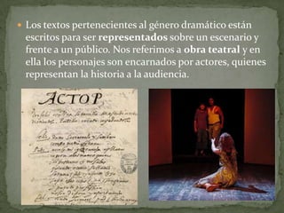 El documento describe las características del género dramático. Se define como un texto escrito para ser representado en un escenario frente a un público, donde los personajes son interpretados por actores. Se caracteriza por el diálogo entre los personajes y por tener una estructura dividida en presentación del conflicto, desarrollo del mismo y su desenlace. Dentro de la obra existen elementos como el monólogo, el aparte y las acotaciones.