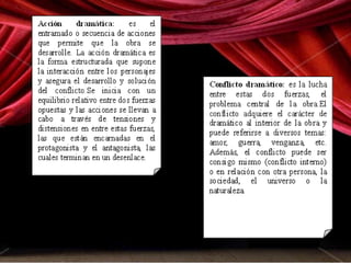 El documento analiza los principales elementos de los textos dramáticos. Define el género dramático como aquel que representa episodios o conflictos de la vida humana a través del diálogo entre los personajes. Explica que la obra dramática tiene como objetivo la obra teatral, la cual incorpora elementos como la escenografía, iluminación, vestuario y actuación de los actores. Finalmente, detalla la estructura interna y externa de las obras dramáticas.