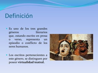 El documento expone la definición y características del género literario del drama, que representa episodios humanos a través de diálogos y acción. Se origina en Grecia con un carácter religioso y se distingue entre tragedia, comedia y drama, cada uno con sus respectivas características. La tragedia aborda destinos adversos, la comedia presenta aspectos cómicos y el drama mezcla ambos elementos para reflejar la vida real.