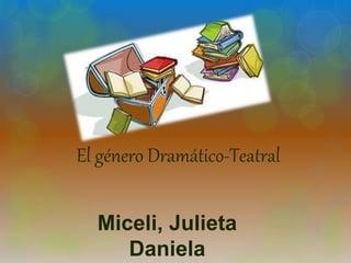 El documento describe el origen y evolución del género dramático-teatral. Se explica que surgió en la antigua Grecia en el siglo V a.C. como representaciones sagradas relacionadas con el culto a Dionisio. Más tarde, dramaturgos como Tespis introdujeron el diálogo entre actores y coro. Los dramaturgos griegos más importantes fueron Esquilo, Sófocles y Eurípides. El teatro evolucionó a través de las épocas clásica, romana, medieval, renacentista y barro