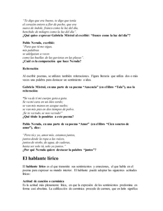 El documento habla sobre los géneros literarios líricos y cómo expresan sentimientos a través de figuras como la comparación y la reiteración. Explica que la poesía utiliza versos, estrofas y rimas para transmitir emociones de manera rítmica. También define conceptos como el hablante lírico y el objeto lírico.