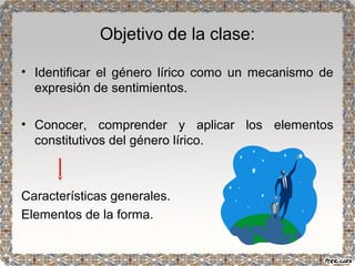 1) El documento trata sobre los elementos del género lírico como forma de expresión de sentimientos. 2) Identifica características como el uso de la primera persona y el verso. 3) Analiza elementos como el hablante lírico, el temple de ánimo, el motivo y el objeto lírico presentes en el poema "Muerte en Hawaii".