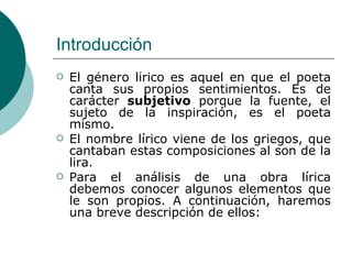 El documento proporciona una introducción al género lírico, explicando que se caracteriza por la expresión de los sentimientos del poeta a través de un hablante lírico. Luego define elementos clave como obra lírica, mundo lírico, hablante lírico, actitud del hablante, motivo lírico y objeto lírico. Finalmente, explica figuras retóricas comunes en la poesía lírica como la comparación, personificación, metáfora e hipérbole.