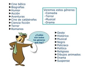 El documento resume los principales géneros cinematográficos como comedia, terror, musical y drama. Describe las características de cada género, incluyendo ejemplos históricos importantes y evolución a través del tiempo. Explica que la comedia se caracteriza por los chistes y la acción cómica, mientras que el terror explora temas como lo desconocido y lo monstruoso. El musical incluye canciones y el drama presenta temas serios y trascendentales de manera realista.