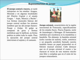 El documento describe diferentes géneros musicales y danzas típicas de Venezuela, incluyendo el joropo (música y danza popular), el vals, los polos y galerones de Margarita, la gaita (música navideña), y la fulía (ritmo costero). Explica las características musicales y regionales de cada uno, así como los instrumentos típicos usados en su interpretación.