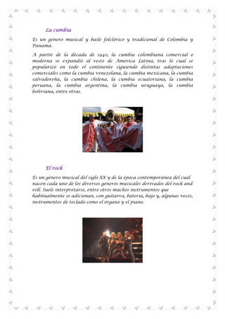 Este documento presenta resúmenes breves de varios géneros musicales populares de América Latina y el mundo, incluyendo la salsa, el vallenato, la cumbia, el rock, el reggaetón, el hip hop, la samba, el mambo, la bachata, el merengue y la balada. Describe el origen, instrumentos y estilos de cada género musical.