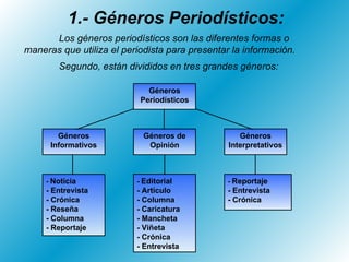 El documento discute los géneros periodísticos. Explica que los géneros periodísticos son diferentes formas de narrar historias en periodismo y pueden ser de buena o mala calidad literaria. También señala que los géneros periodísticos evolucionaron de formas literarias iniciales a los géneros específicos que conocemos hoy en día.