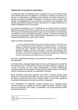 El documento discute las definiciones y clasificaciones de los géneros periodísticos según varios autores. Define los géneros como formas de comunicación establecidas culturalmente para interpretar la realidad e informar al público. Distingue entre géneros informativos como la noticia y géneros de opinión como el artículo. También describe la evolución histórica de los géneros y los clasifica en grupos como informativos, de opinión e interpretativos.