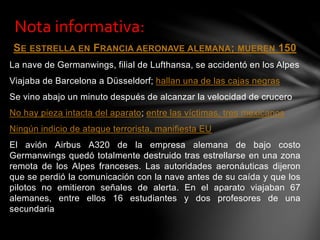 El documento habla sobre el accidente de un avión alemán de la compañía Germanwings que se estrelló en los Alpes franceses, matando a las 150 personas a bordo. El avión se accidentó poco después de alcanzar su velocidad de crucero y se perdió la comunicación con los pilotos antes de la caída. Entre las víctimas había 67 alemanes y 3 mexicanos. Las autoridades dicen que no hay indicios de un ataque terrorista.