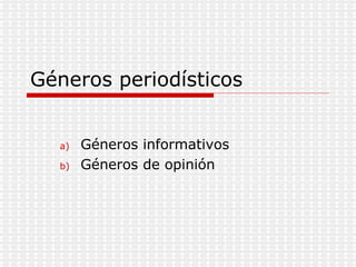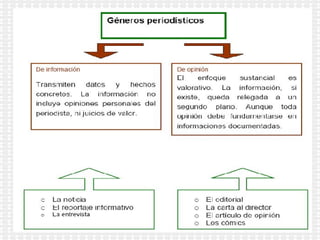 El documento trata sobre los géneros periodísticos y su relación con los medios de comunicación, enfocándose en la prensa escrita. Se describen los géneros informativos, como la noticia, el reportaje y la entrevista, y se detallan sus estructuras y elementos clave. También se abordan los géneros de opinión, como editoriales y cartas al director, y su contenido y estilo característicos.