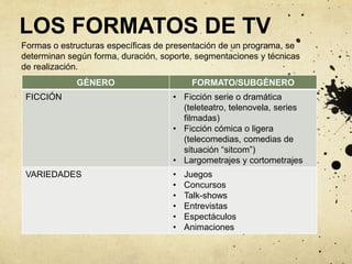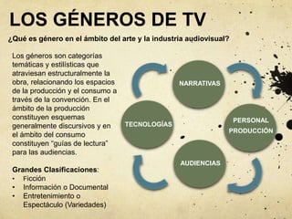 Este documento describe los géneros y formatos de televisión. Explica que los géneros son categorías temáticas y estilísticas que guían la producción y el consumo a través de convenciones. Los principales géneros son la ficción, la información o documental, y el entretenimiento o espectáculo. Luego detalla varios formatos o subgéneros populares dentro de cada género principal como series de ficción, concursos de variedades, noticieros informativos y documentales divulgativos. Finalmente, enumera