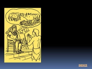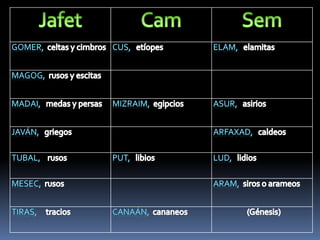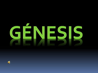 El documento resume las principales secciones del libro del Génesis de la Biblia. La primera parte (capítulos 1-11) relata la historia de la creación, Adán y Eva, Caín y Abel, el diluvio de Noé y la dispersión de las naciones. La segunda parte (capítulos 12-50) se centra en las vidas de los patriarcas Abraham, Isaac y Jacob. Fue escrito por Moisés y es el primer libro del Pentateuco.