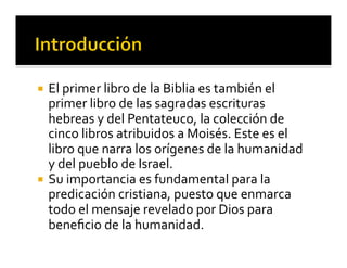 El documento presenta una introducción al Antiguo Testamento, destacando su estructura, que incluye la narración de los orígenes de la humanidad y del pueblo de Israel a través de historias centradas en la creación, el pecado y los patriarcas. Se enfatiza la importancia de estos relatos para la teología y la ética cristianas, así como su relevancia en la identidad del pueblo de Dios. Además, se describen los elementos narrativos que permiten entender la saga del Antiguo Testamento y su significado para los creyentes.