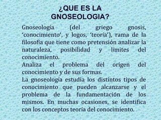 Este documento trata sobre la gnoseología, que es la rama de la filosofía que analiza la naturaleza, posibilidad y límites del conocimiento. Explica que la gnoseología estudia los distintos tipos de conocimiento y cómo se adquieren, así como los problemas fundamentales del conocimiento como su posibilidad, objeto, origen y verificación. También define conceptos como empirismo, racionalismo e intuicionismo como teorías sobre el origen del conocimiento, e introduce las principales corrientes y pensadores que abordan estos problemas.