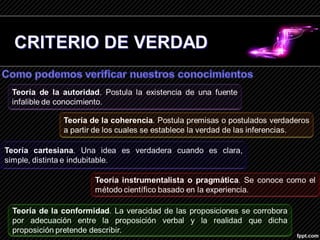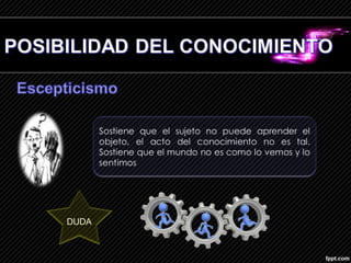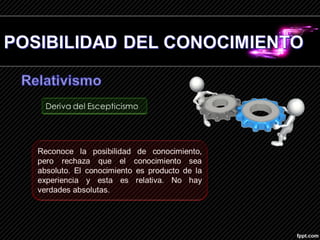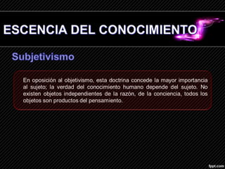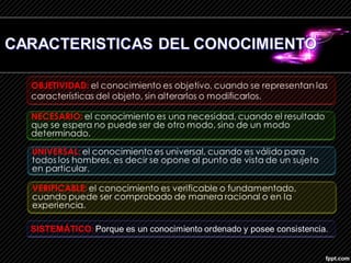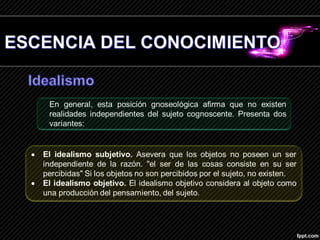 La gnoseología estudia el conocimiento humano y las relaciones entre el sujeto cognoscente, el objeto cognoscible y la representación. Examina cómo el sujeto obtiene información del objeto a través de los sentidos externos e internos que generan imágenes sensibles y experiencias, y cómo la inteligencia luego forma conceptos sobre el objeto.