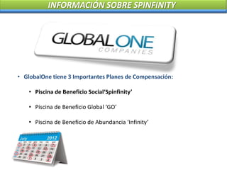 Este documento proporciona información sobre Spinfinity, uno de los tres importantes planes de compensación de GlobalOne. Spinfinity paga a los afiliados 6-10 veces al mes y las rotaciones ocurren cada 3 días. Los afiliados avanzan de grupo en grupo, obteniendo mayores comisiones conforme alcanzan posiciones más altas. El poder de Spinfinity radica en que a medida que los afiliados refieren más personas, se crean múltiples centros de beneficios que generan ingresos recurrentes.