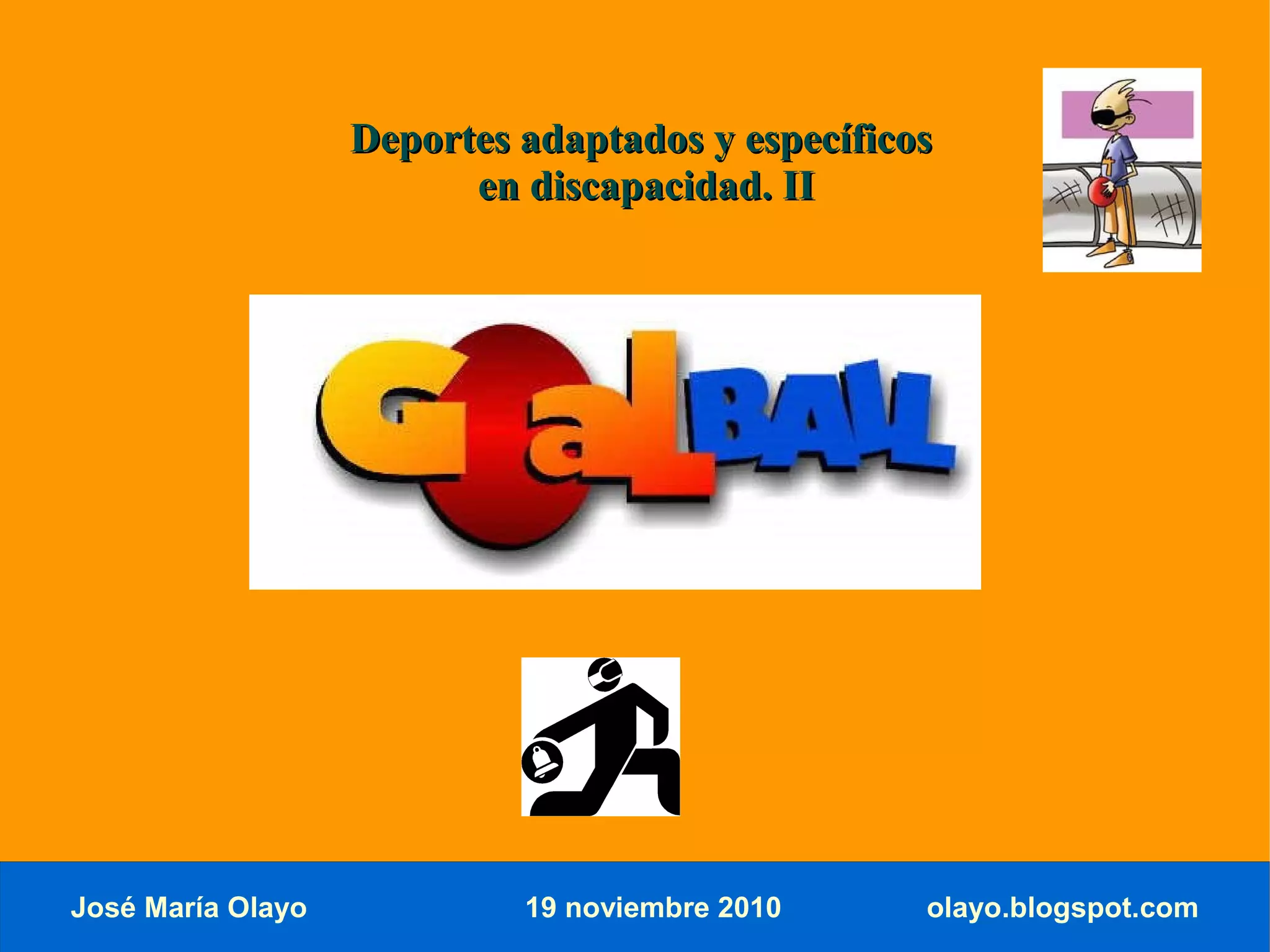 El documento describe el deporte de Goalball, creado para jugadores ciegos. Se juega en una cancha de 18x9 metros con porterías de 9 metros de ancho. Los jugadores usan antifaces y deben detectar el balón con cascabeles por el sonido. Se anotan goles lanzando el balón en la portería contraria. El Goalball surgió en 1946 y se convirtió en deporte paralímpico en 1976. La IBSA supervisa las reglas y competiciones internacionales del deporte.