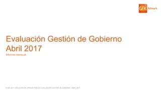 El documento resume los resultados de una encuesta de opinión pública realizada en abril de 2017 sobre la evaluación de la gestión del gobierno. La aprobación de la presidenta Bachelet alcanzó un 28%, su mejor evaluación en 12 meses. Respecto a las preferencias presidenciales, Sebastián Piñera lidera con un 24% mientras que Beatriz Sánchez irrumpe en tercer lugar con 11%. Las relaciones internacionales continúan siendo el área de gobierno mejor evaluada.