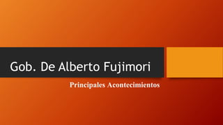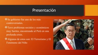 El gobierno de Alberto Fujimori enfrentó graves problemas sociales y económicos como el terrorismo de Sendero Luminoso y el MRTA, y el Fenómeno de El Niño de 1982-1983 que afectó severamente la región de Piura. Fujimori utilizó tácticas controversiales como escuadrones de la muerte como el Grupo Colina para combatir a Sendero Luminoso, lo que resultó en masacres como la de La Cantuta. Además, el MRTA tomó la residencia del embajador japonés en 1996 y mantuvo re