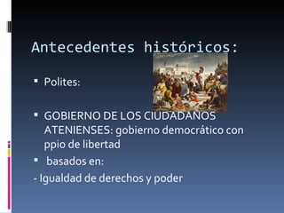 El documento describe los orígenes históricos de la democracia en la antigua Atenas y sus principios fundamentales como la igualdad de derechos y el gobierno de los ciudadanos. También define las características de un régimen democrático moderno como el poder limitado por la constitución, elecciones libres y los derechos de los ciudadanos. Por último, resume las tres tradiciones democráticas principales: la ateniense, la anglosajona y liberal, y la republicana inspirada por la antigua Roma y Montesquieu