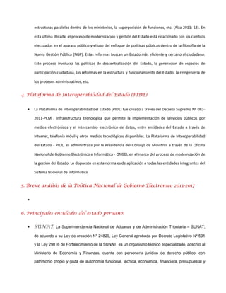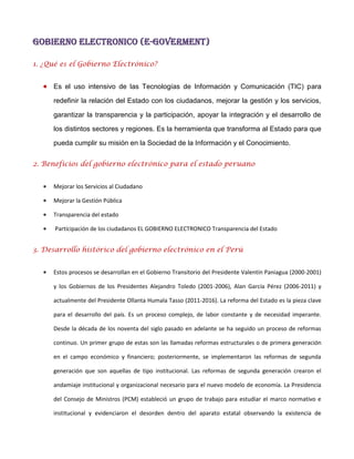 El gobierno electrónico en Perú utiliza tecnologías de información y comunicación para mejorar la relación entre el Estado y los ciudadanos, buscando transparencia y participación. Desde el año 2000, se han implementado reformas que han modernizado la gestión pública y han creado plataformas como la PIDE para facilitar servicios electrónicos. Las principales entidades del Estado, como SUNAT y RENIEC, desempeñan roles clave en este proceso de modernización.