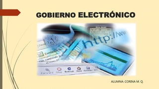 El documento describe el gobierno electrónico, sus características, ventajas, fases de implementación, modelos de interacción y principales requisitos. El gobierno electrónico usa las tecnologías de información y comunicación para proveer servicios gubernamentales de manera más eficiente y accesible a los ciudadanos. Sus principales beneficios incluyen operaciones más rápidas, transparencia y participación ciudadana.