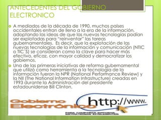 El documento describe el concepto de gobierno electrónico, incluyendo sus antecedentes, definición, importancia e impacto. Explica que el gobierno electrónico utiliza las tecnologías de la información para mejorar la gestión gubernamental y los servicios a los ciudadanos. También describe las ventajas como una mayor eficiencia y participación ciudadana, e inconvenientes como la falta de recursos y acceso a la tecnología.