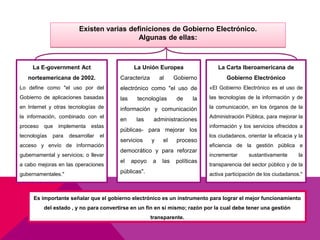 El documento aborda el concepto de gobierno electrónico, definiéndolo como el uso de tecnologías de la información y comunicación por parte del gobierno para mejorar la interacción y los servicios ofrecidos a los ciudadanos. Destaca la importancia de la transparencia, la participación ciudadana y la eficiencia en la gestión pública a través de plataformas digitales. Además, se analizan las fases del gobierno electrónico y los principios que guían su implementación, enfatizando la necesidad de colaboración con el sector privado para su éxito.