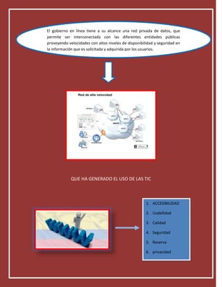 El documento habla sobre la estrategia de gobierno digital liderada por el Ministerio de Tecnologías de la Información y las Comunicaciones en Colombia. Esta estrategia busca mejorar la eficiencia y transparencia para los ciudadanos a través del uso de las tecnologías de la información y la comunicación (TIC) que permiten un intercambio bidireccional de información y participación ciudadana en la toma de decisiones.