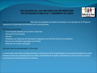 Estos documentos describen varios portales del gobierno colombiano relacionados con la contratación pública, educación, contabilidad pública y la presidencia. Los portales proveen información sobre procesos de contratación del estado, créditos educativos, normas contables públicas, y actividades del gobierno nacional respectivamente.