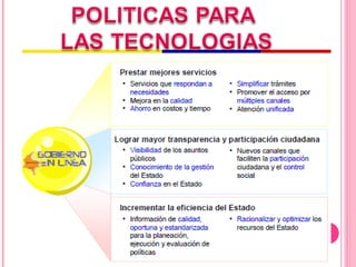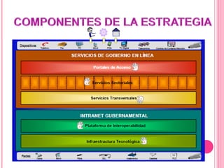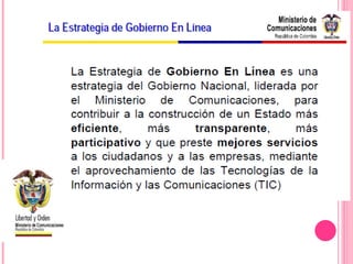 El documento describe el gobierno en línea territorial como el uso de tecnologías y comunicaciones para servir a la comunidad y conocer la gestión administrativa del municipio. Es una estrategia de gobierno que contribuye a construir un estado más eficiente, transparente y participativo mediante el aprovechamiento de las TIC, ofreciendo mejores servicios a los ciudadanos y empresas.
