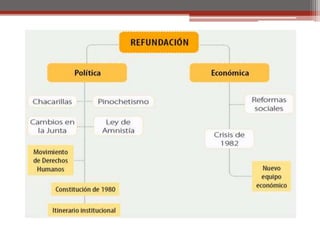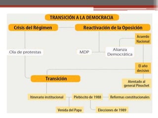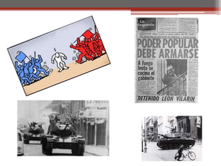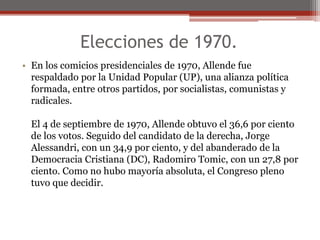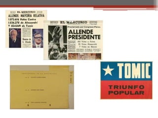 El documento resume los principales hitos del gobierno de Salvador Allende en Chile desde su elección en 1970 hasta el golpe militar de 1973 encabezado por Augusto Pinochet. Allende asumió la presidencia como candidato de la Unidad Popular con el apoyo de partidos de izquierda. Implementó reformas socialistas que generaron oposición y conflictos con el Congreso. El 11 de septiembre de 1973, las Fuerzas Armadas dieron un golpe de Estado, Allende se suicidó y Pinochet asumió el control del país como jefe de una junta