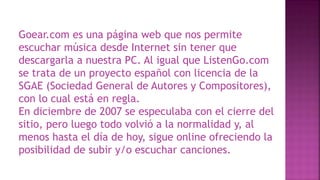 Goear.com permite a los usuarios escuchar música desde la web sin descargar archivos. El sitio ofrece una amplia selección de canciones organizadas por género y artista. Goear provee una alternativa sencilla para compartir música en línea sin necesidad de descargar archivos.