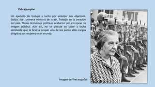 Golda Meir fue la primera ministra de Israel. Nació en 1898 en Ucrania y emigró a los Estados Unidos de niña. Más tarde se mudó a Palestina y trabajó para establecer el estado de Israel, participando en las negociaciones para la partición de Palestina en 1947 y firmando el acta de independencia de Israel en 1948. Sirvió como primera ministra desde 1969 hasta 1974, pero renunció después de la guerra de Yom Kipur de 1973 debido a la insatisfacción con su manejo del conflicto.