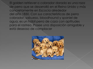 El golden retriever es una raza de perro desarrollada en Escocia en 1850 con aptitudes para la caza y el rastreo. Existen dos tipos, el británico y el americano/canadiense, siendo este último más alto y menos fornido. Son conocidos por su temperamento amable, amigable y confiado que los convierte en buenas mascotas familiares. Requieren estimulación mental y ejercicio diario para mantenerse saludables y evitar conductas destructivas.