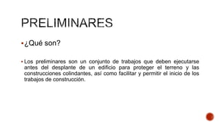 Este documento describe los conceptos y procedimientos preliminares para la construcción de edificaciones, incluyendo la limpieza y trazo del terreno, excavaciones, rellenos, construcción de tapiales, cercas provisionales y bodega temporal. Explica los materiales, herramientas y unidades de trabajo para cada actividad preliminar, así como los costos por región de acuerdo a tablas de referencia.