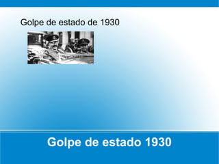 El documento resume brevemente varios golpes de estado en la historia de Argentina, incluyendo el derrocamiento de Yrigoyen en 1930, el golpe contra Perón en 1955 liderado por el general Lonardi, la Revolución del 43 que derrocó a Castillo en 1943, el golpe de Guido contra Frondizi en 1962, y el golpe de Onganía contra Illia en 1966. También menciona que Videla derrocó a Perón en 1976.