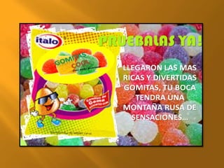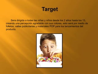 Este documento presenta un plan de marketing para el lanzamiento de un nuevo producto llamado "Gomitas Cool" dirigido a niños entre 2 y 13 años. El plan incluye estrategias de marketing BTL como eventos promocionales y actividades en puntos de venta con un personaje llamado "Gomicool" para familiarizar a los niños y padres con el producto. También incluye una estrategia de medios ATL que utilizará publicidad en canales de televisión venezolanos e impresos para dar a conocer las características y ventajas del