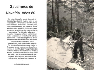 El primer documento describe el trabajo de los habitantes de Navafría cortando y transportando pinos en los años 80, incluyendo a hacheros, carreteros y gabarreros. El segundo documento presenta a Servando de Castro, el abuelo del autor, quien trabajó como gabarrero transportando leña en mulas y burros para venderla. El tercer documento muestra a la familia del autor en distintas épocas y ocupaciones como trabajadores de construcción, agricultura y en una fábrica de cristal.