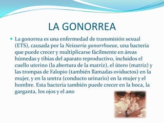 El documento habla sobre la gonorrea, una enfermedad de transmisión sexual causada por la bacteria Neisseria gonorrhoeae. Explica que se transmite principalmente a través del sexo vaginal, anal u oral sin protección con una pareja infectada, y también de una madre embarazada a su bebé durante el parto. Describe los síntomas como dolor o quemazón al orinar, descarga vaginal y úlceras en la garganta. Finalmente, recomienda la abstinencia sexual como el único método de prevención absoluto, pero también sugi
